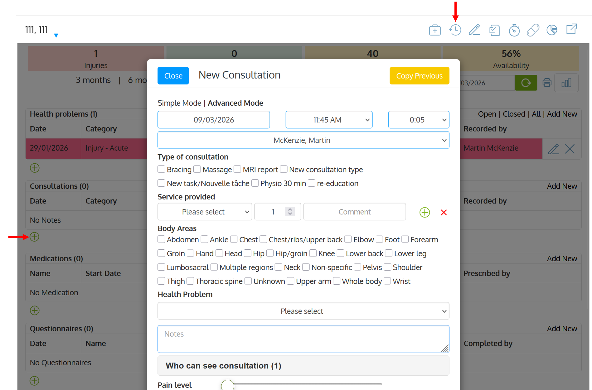 To add a note / consultation, open the health history page, click the Add new or + in the Consultations section. The note recording form will automatically pop up.