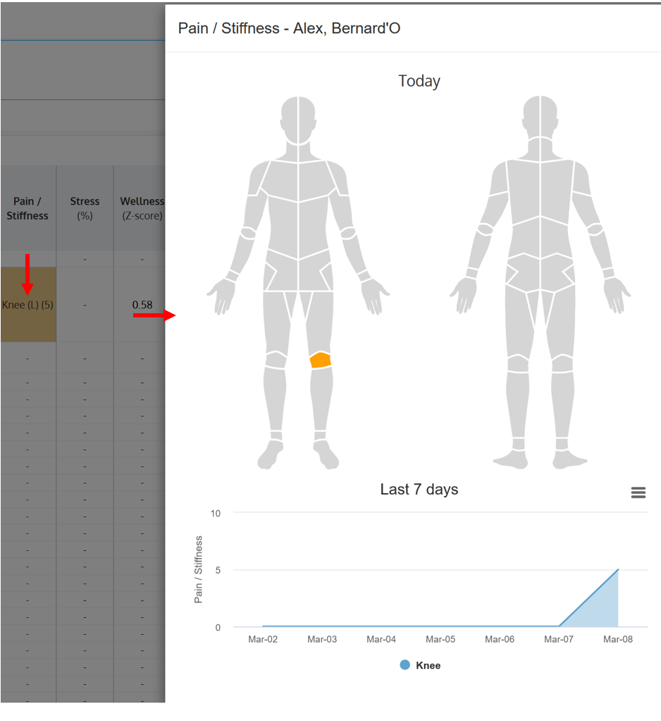 The pain and stiffness tracker allows athletes to self-report unusual pain or stiffness easily, when completing their wellness questionnaire.