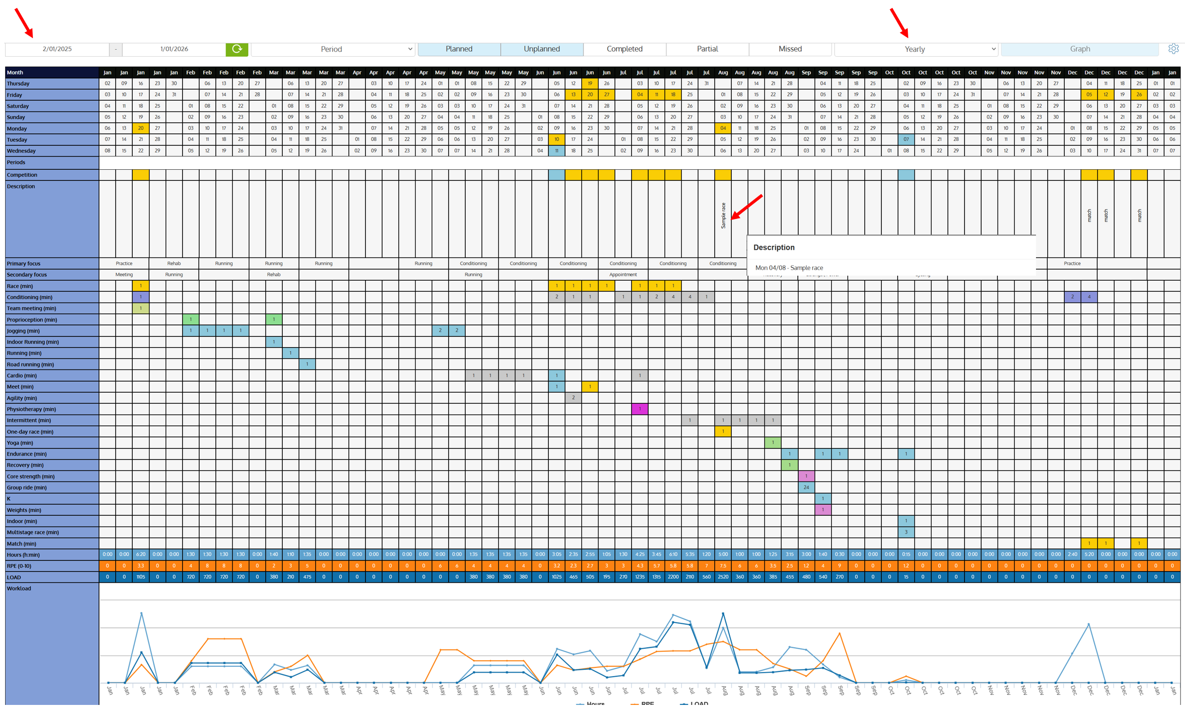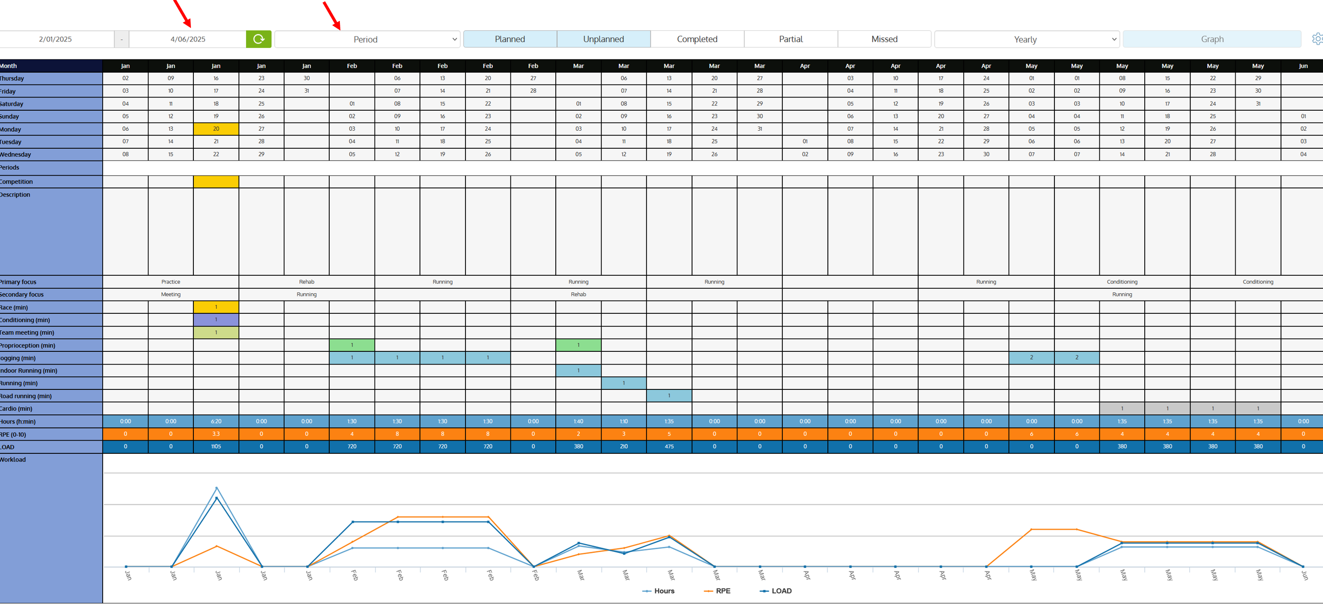 - The RPE row represents the average sRPE for each week, when sRPE is recorded