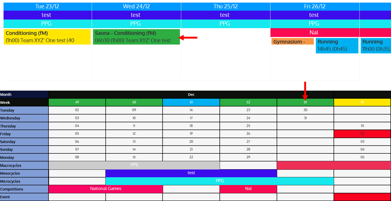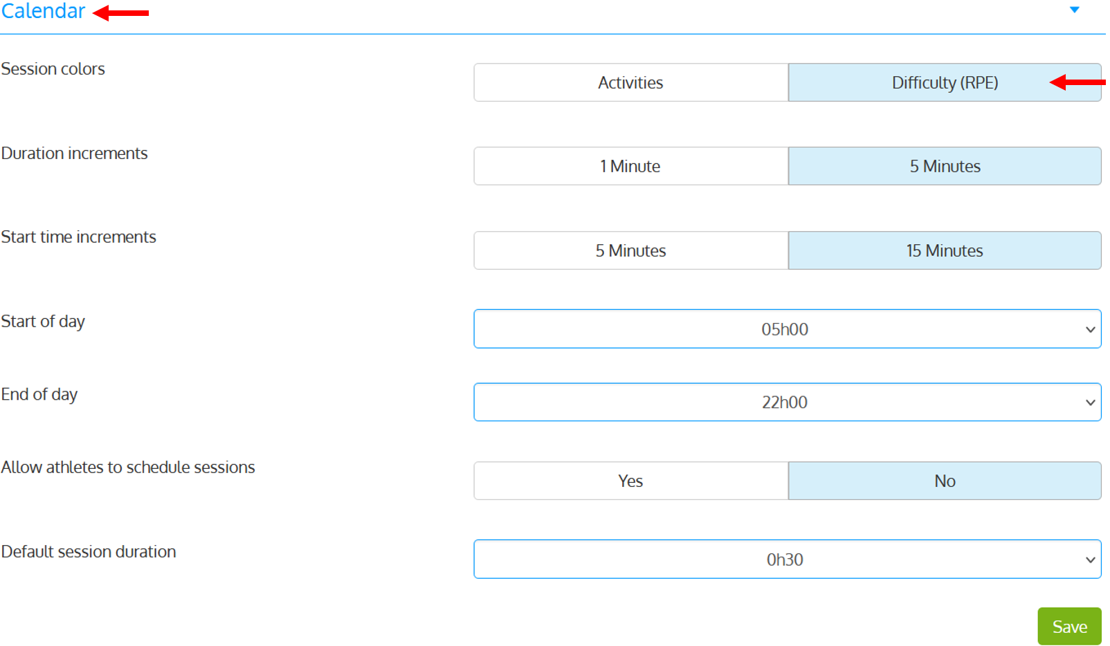 When you are using the sRPE method, and are defining the planned sRPE when creating sessions, the color set for each sRPE zones will be automatically displayed on calendars.